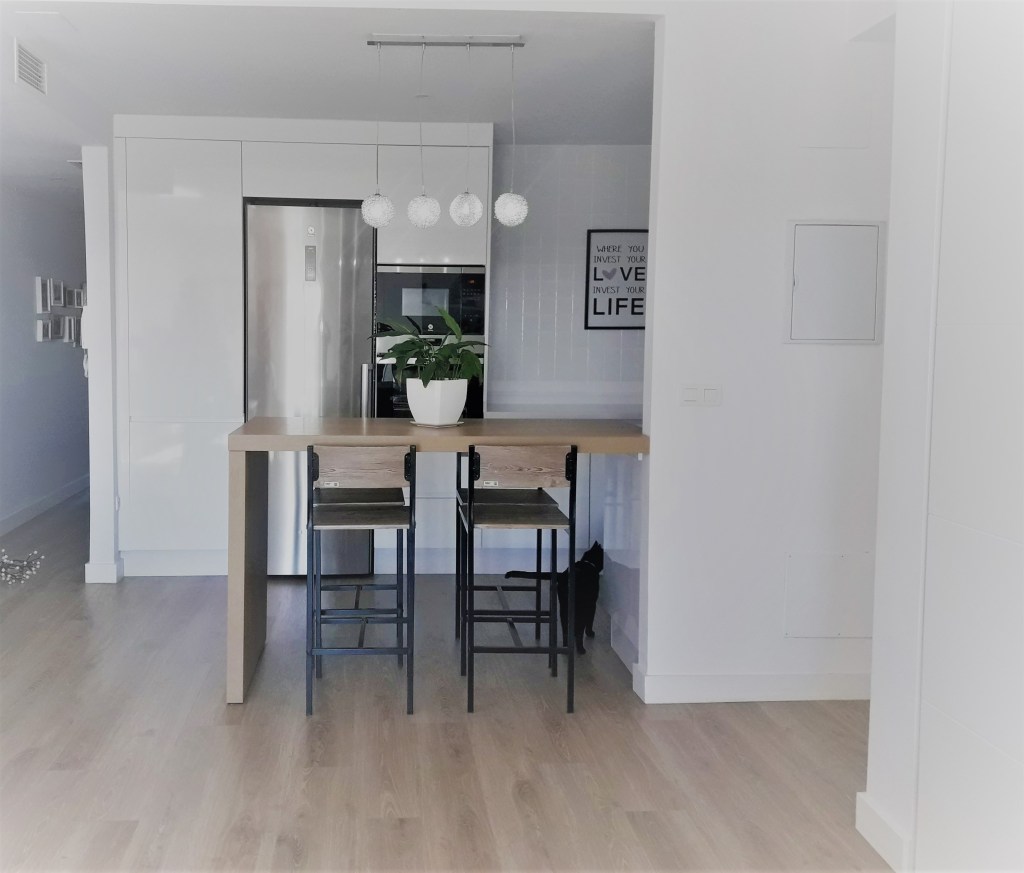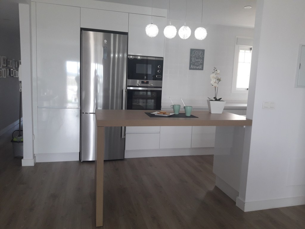 Dar Sin duda, una de las grandes ventajas de las cocinas abiertas al salón es que ganaremos en espacio. Por eso, es muy frecuente verlas en pisos pequeños o loft. La casa en general se ve más amplia. Además, la cocina optamos por diseñarla con lÍneas rectas, sencillas y toda ella en blanco tanto muebles como encimera.